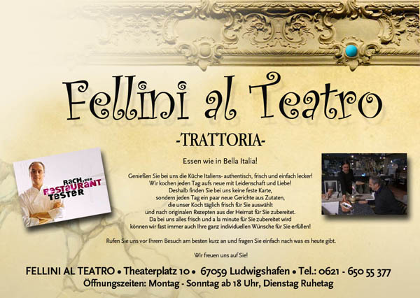 Nicht nur gegenüber im Pfalzbau Theater heißt es:"Vorhang auf!", sondern auch hier bei uns. Wir "inszenieren" die "kulinarische Vielfalt Italiens". Dabei sind wir von Montag bis Sonntag ab 17:30 bis 22:30 für Sie da.